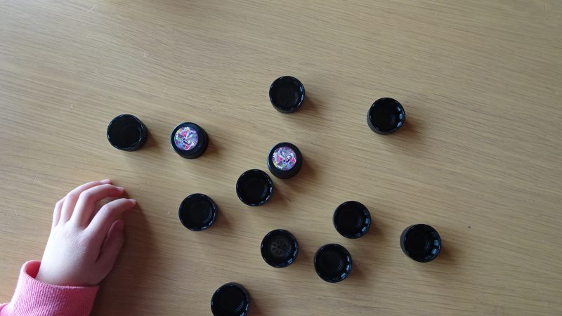 ペットボトルキャップにシールを貼って裏返して置いたのをめくって同じ色のシールのキャップをそろえる『ペットボトルキャップの記憶ゲーム』です☆