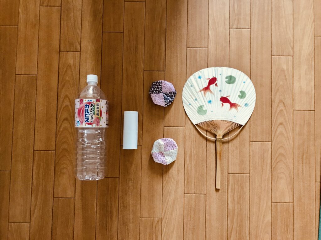 トイレットペーパーの芯 お家でできる【高齢者(デイサービス・老人ホーム)室内レクリエーション】トイレットペーパーの芯とペットボトルとうちわとお手玉を使って『巻き巻きゲーム』