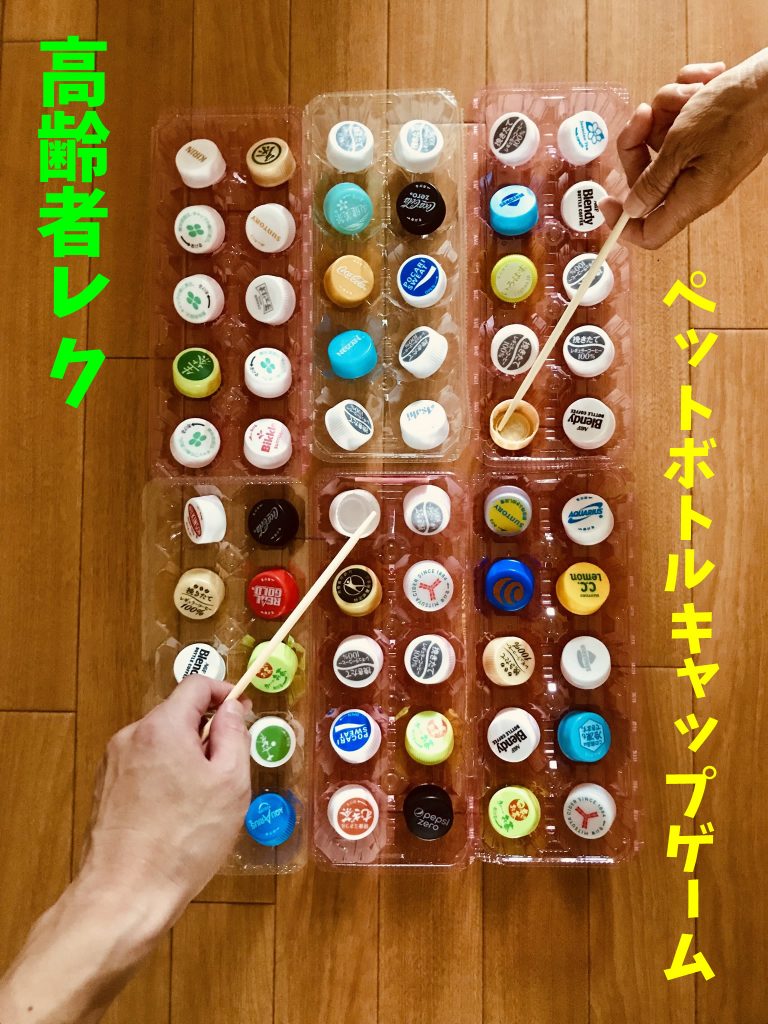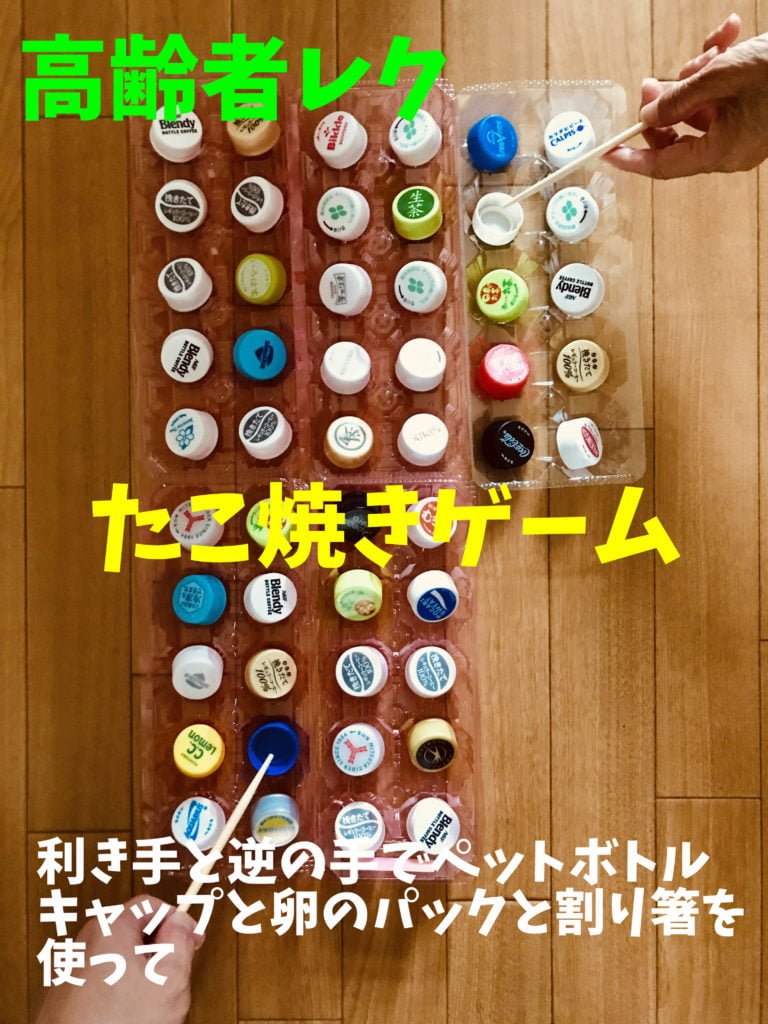 ペットボトルキャップ 【高齢者室内レクリエーション】利き手と逆の手でペットボトルキャップと卵のパックと割り箸を使って『50個たこ焼きゲーム』