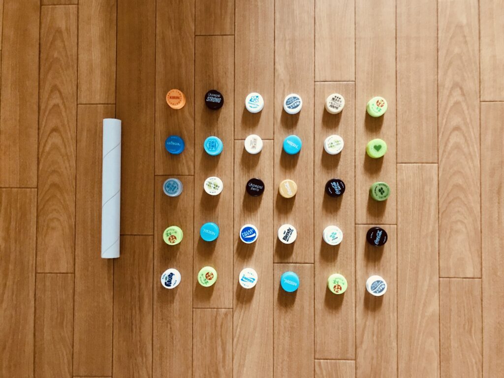 ペットボトルキャップ 【高齢者室内レクリエーション】ラップの芯と30個のペットボトルキャップを使って『キャップ打ち』