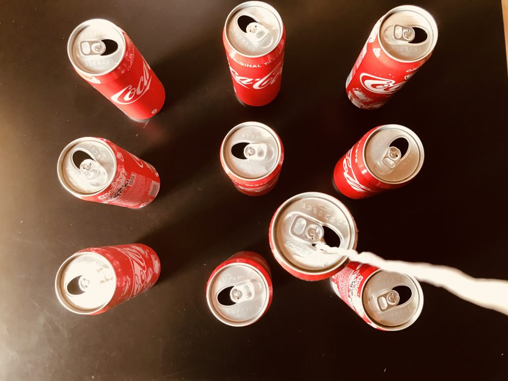 高齢者レクリエーション 【高齢者(在宅介護)室内レクリエーション】空き缶とラップの芯と割り箸と紐を使って『9個空き缶釣りゲーム』に挑戦してみた