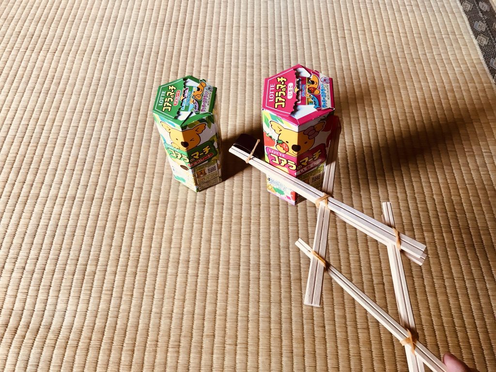 高齢者レクリエーション 【高齢者(在宅介護)室内レクリエーション】ペットボトルキャップと割り箸と輪ゴムの手作りマジックハンドを使って『2個ロッテコアラのマーチの空き箱つかみゲーム』
