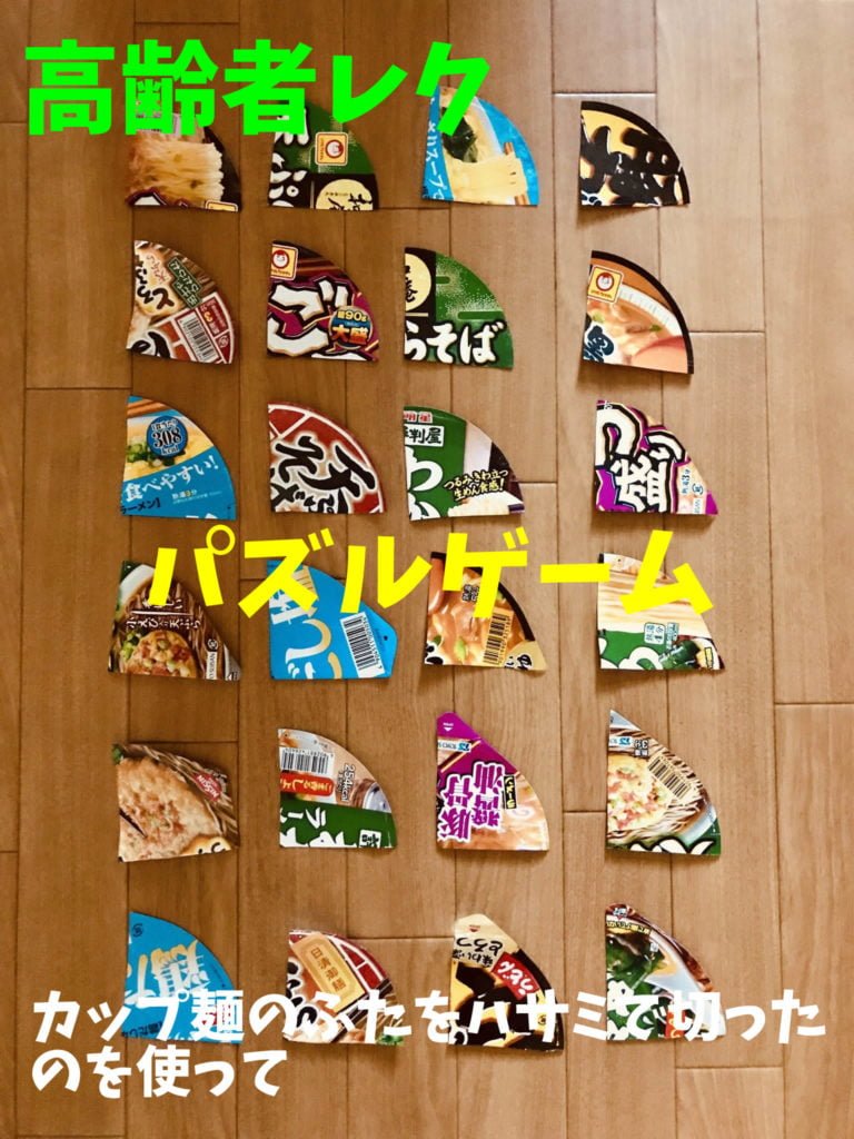 高齢者レクリエーション 【高齢者室内レクリエーション】カップ麺のふたをハサミで切ったのを使って『6枚手作りジグソーパズルゲーム』