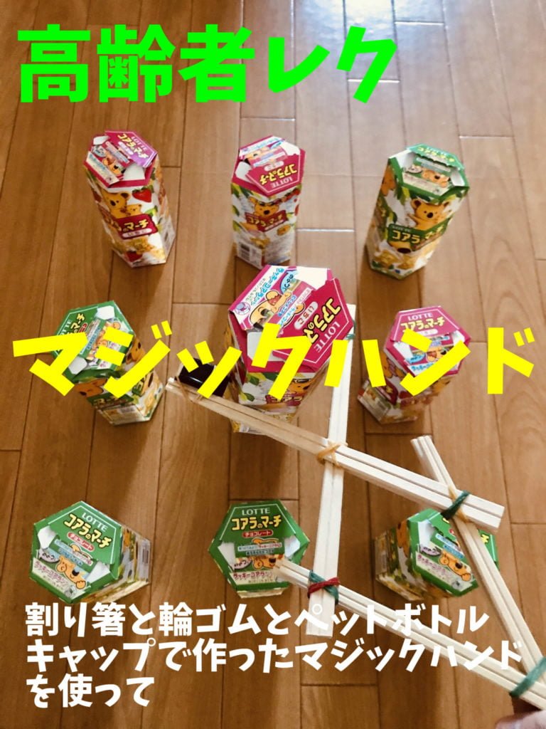 高齢者レクリエーション 【高齢者室内レクリエーション】割り箸と輪ゴムとペットボトルキャップで作ったマジックハンドを使って『9個ロッテコアラのマーチの空き箱つかみゲーム』