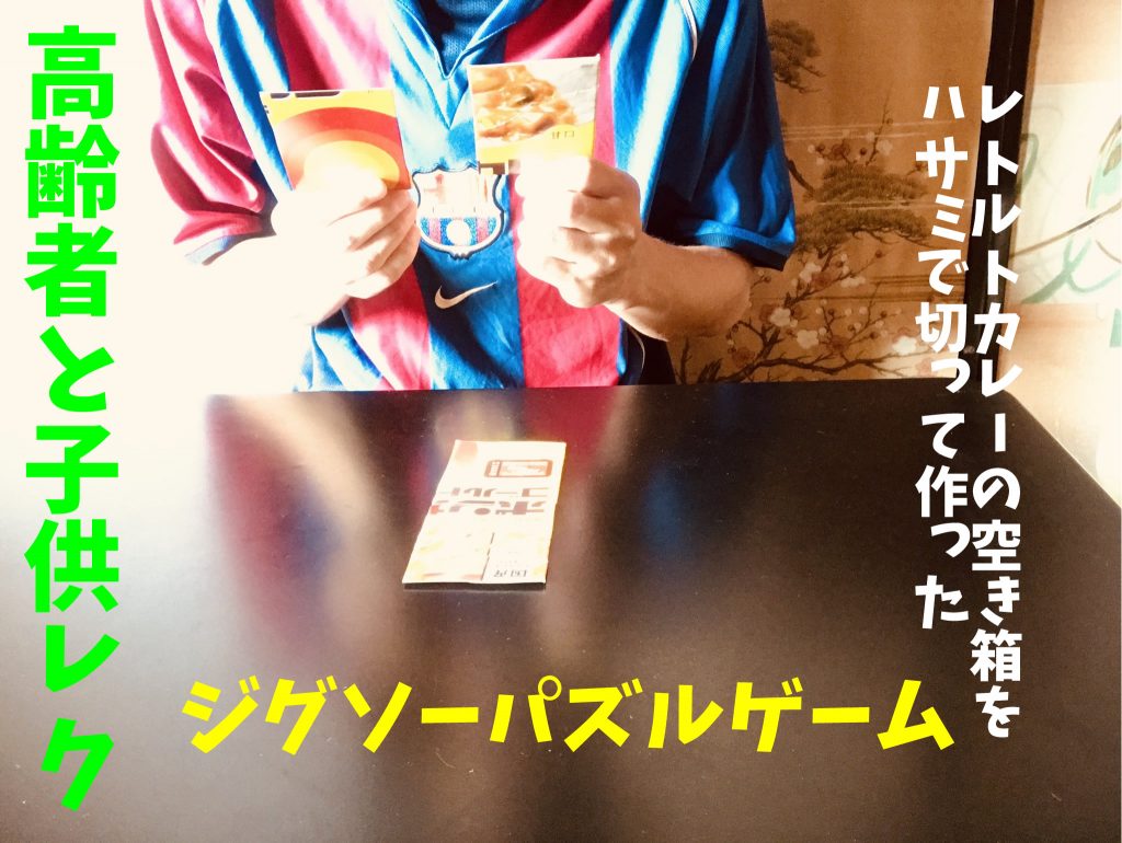 高齢者レクリエーション 【高齢者と子供向け室内レクリエーション】レトルトカレーの空き箱をハサミで切って作った『ジグソーパズルゲーム』【FCバルセロナユニフォームVer.】