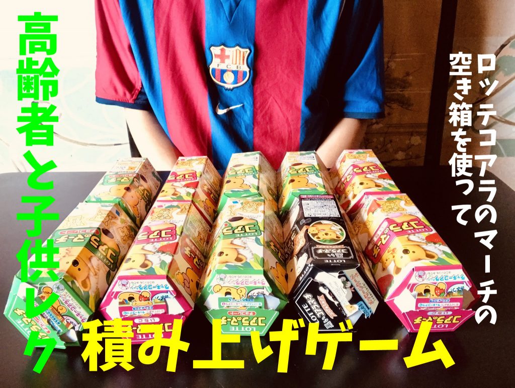 高齢者レクリエーション 【高齢者と子供向け室内レクリエーション】ロッテコアラのマーチの空き箱を使って『積み上げゲーム』【FCバルセロナユニフォームVer.】