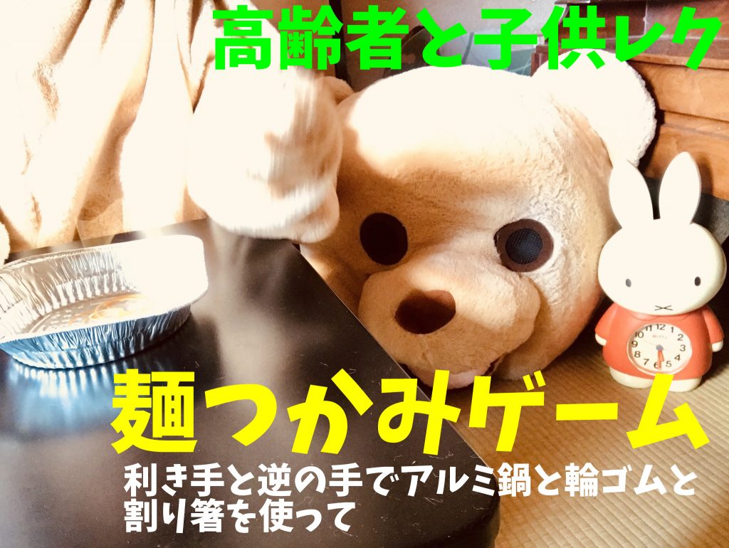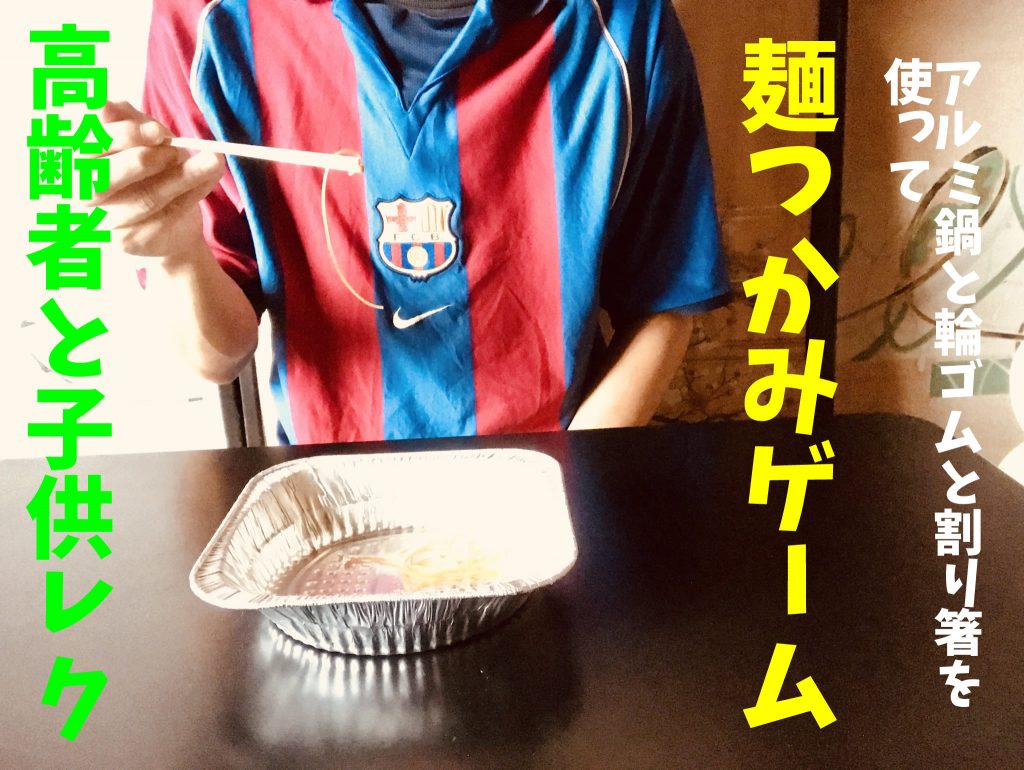 高齢者レクリエーション 【高齢者と子供向け室内レクリエーション】アルミ鍋と輪ゴムと割り箸を使って『麺つかみゲーム』【FCバルセロナユニフォームVer.】
