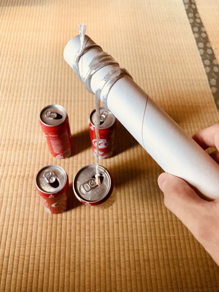 高齢者レクリエーション 【高齢者室内レクリエーション】コカ・コーラの空き缶とラップの芯と割り箸と紐を使って『4個空き缶釣りゲーム』に挑戦してみた