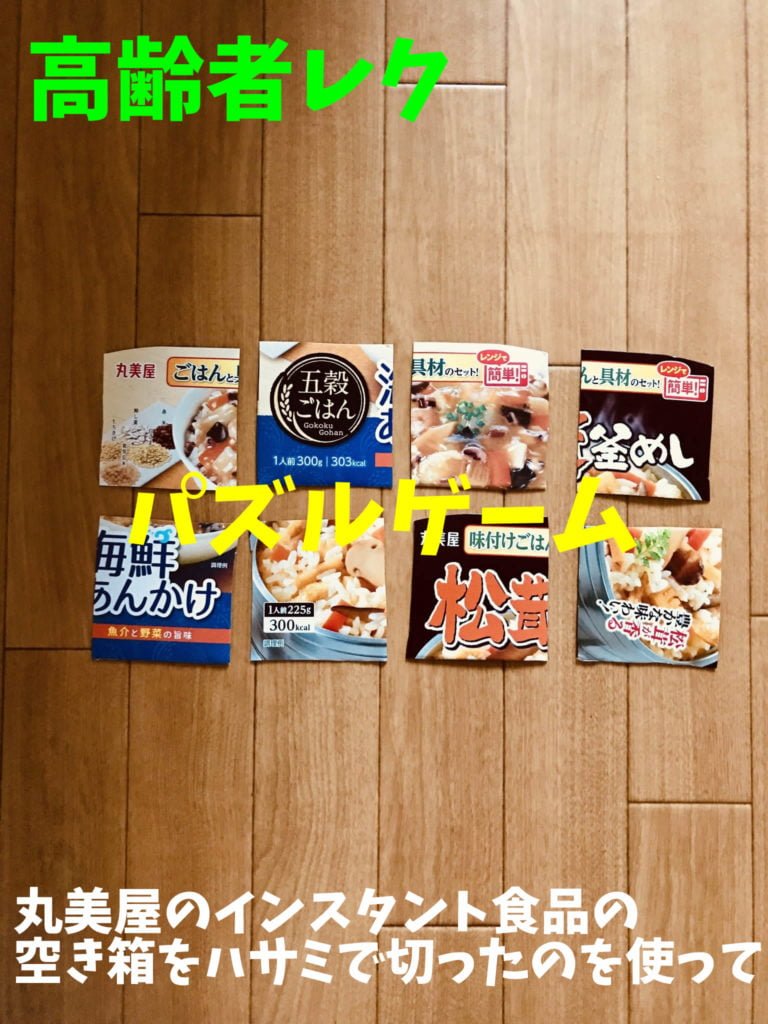 高齢者レクリエーション 【高齢者室内レクリエーション】丸美屋のインスタント食品の空き箱をハサミで切ったのを使って『2箱手作りジグソーパズルゲーム』