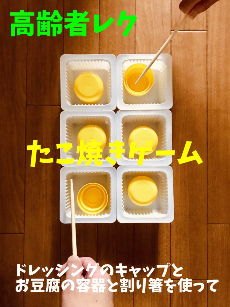高齢者レクリエーション 【高齢者室内レクリエーション】ドレッシングのキャップとお豆腐の容器と割り箸を使って『6個大たこ焼きゲーム』
