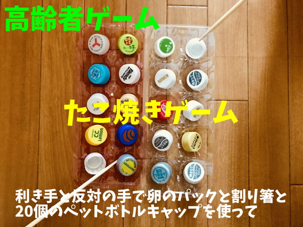 ペットボトルキャップ 【高齢者室内レクリエーション】利き手と反対の手でペットボトルキャップと卵のパックと割り箸を使って『20個たこ焼きゲーム』