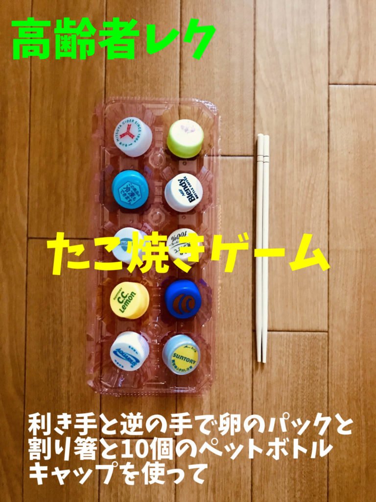 ペットボトルキャップ 【高齢者室内レクリエーション】利き手と逆の手でペットボトルキャップと卵のパックと割り箸を使って『たこ焼きゲーム』